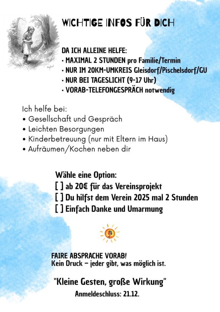 Entlastung – Wir unterstützen sie im Alltag mit Herz, Verlässlichkeit und praktischer Hilfe Wir unterstützen dort, wo es gerade gebraucht wird:° Einkäufe, Botengänge & Alltagshilfen° Begleitung zu Arztterminen° Hilfe im Haushalt & Aussortieren° Büroorganisation & Formularhilfe° Fahrdienste° Tiersitting° Gemeinsam Zeit verbringen